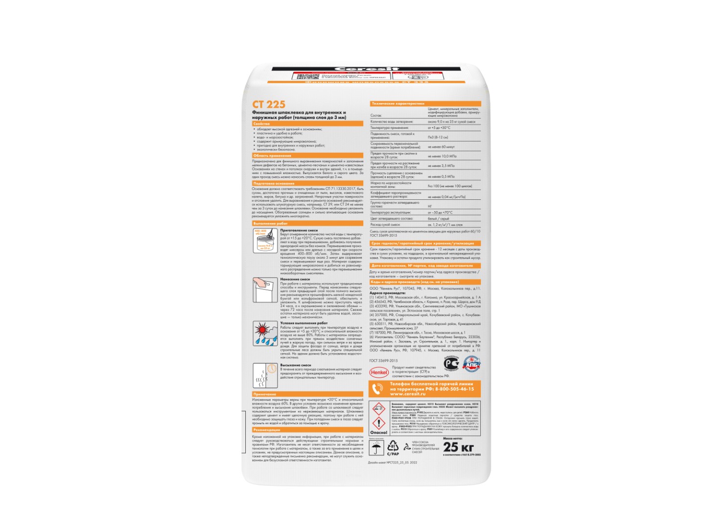 Шпаклевочная цементная смесь CT 225 применяется в финишном выравнивании поверхностей. Она качественно устраняет мелкие дефекты. Используется снаружи и изнутри зданий. Подходит для оснований из бетона, цементно-известковых и цементно-песчаных покрытий.