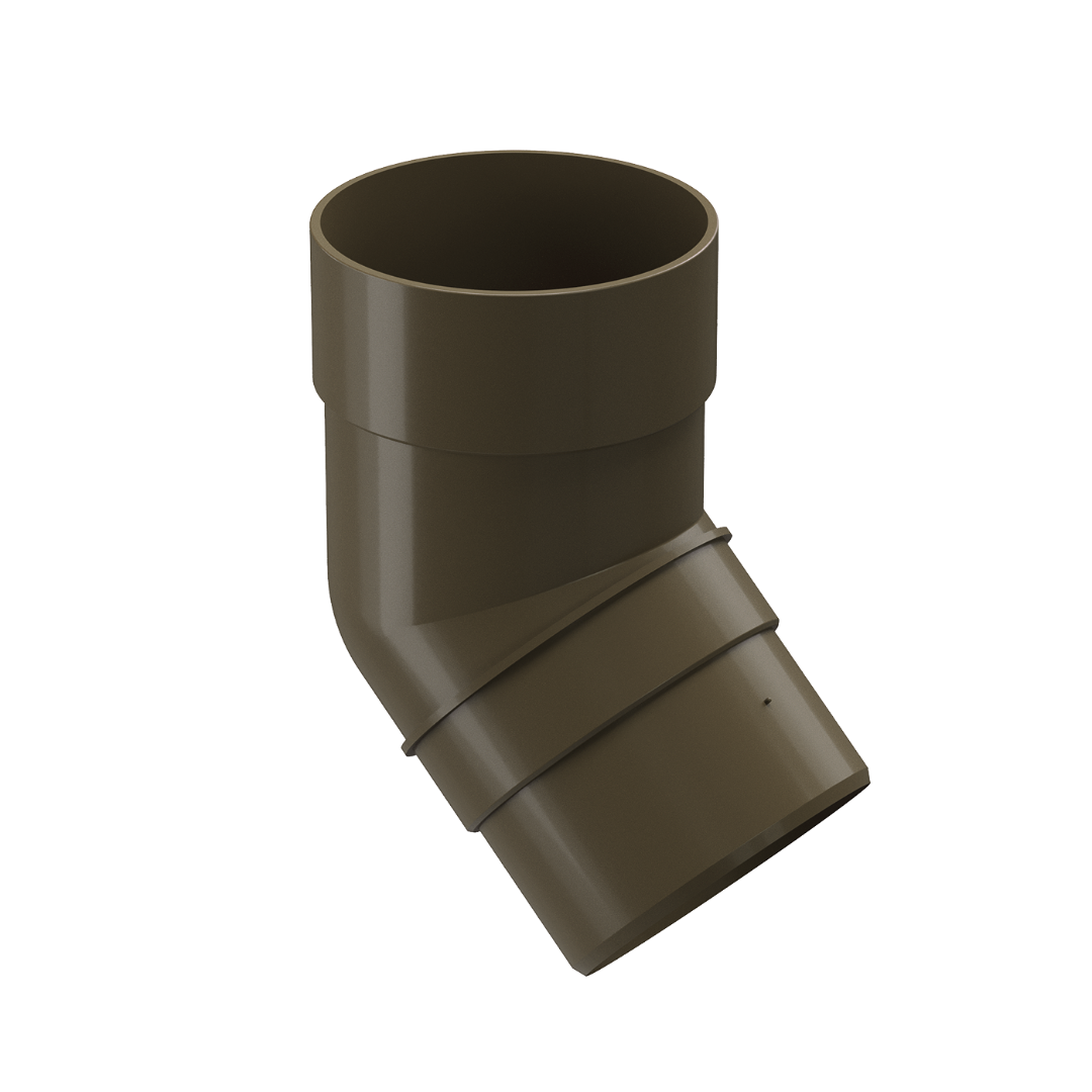 Колено водосточной трубы 45 градусов, выполненное в цвете «Каштан» применяется при создании узла связи между воронкой желоба и трубой идентичного цвета.