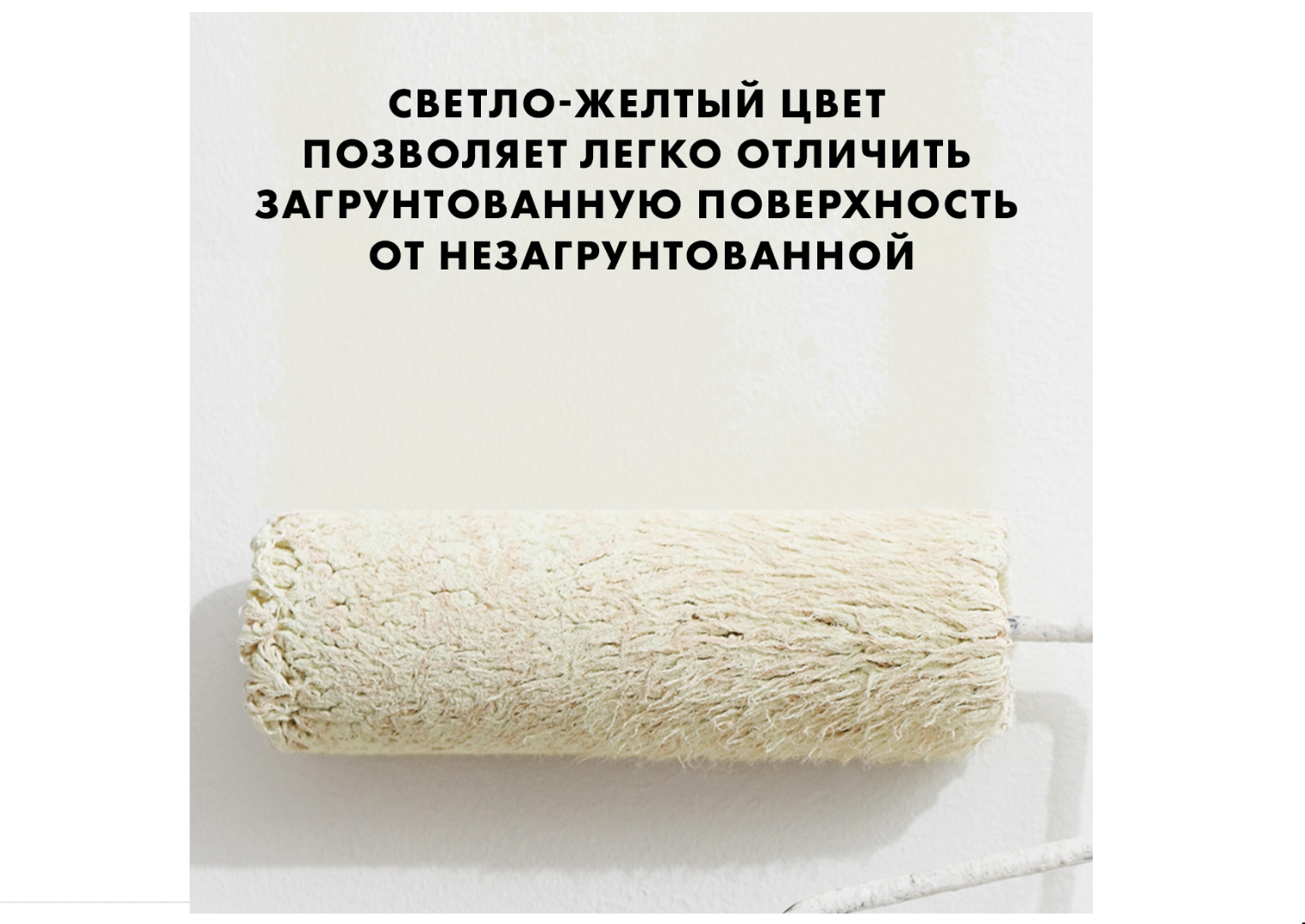 Грунтовка сохраняет паропроницаемость обрабатываемых оснований и эффективно связывает пылевые частицы на их поверхности. В состав введён пигмент светло-жёлтого оттенка, что позволяет легко отличать загрунтованные участки от необработанных.