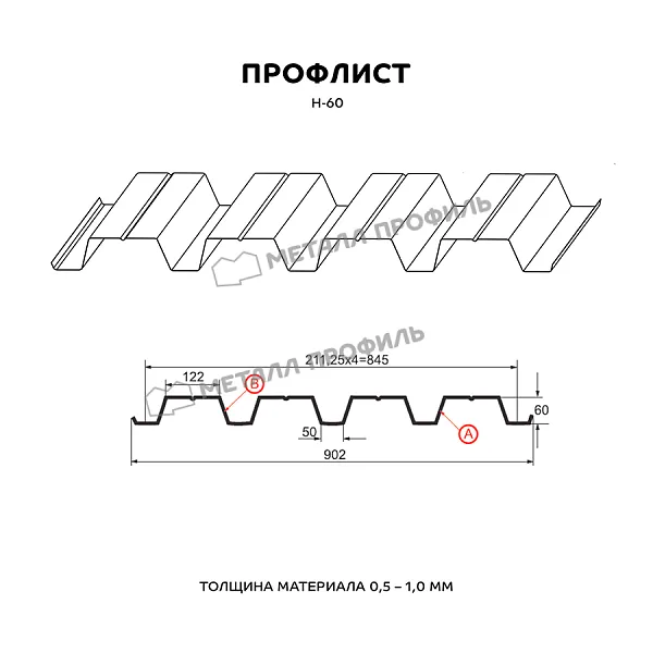 Профлист МЕТАЛЛ ПРОФИЛЬ Н-60x845-A (ОЦ-01-БЦ-0,8) — популярный материал в Нижнем Новгороде для монтажа профилированного листа. Изначально он представляет собой лист оцинкованной стали с покрытием. Общая толщина стальной основы с цинковым и декоративно-защитным покрытием составляет 0.8 мм.После проката на специальном оборудовании сталь приобретает рисунок из повторяющихся волн. Такая конфигурация придает профилю несущую способность.